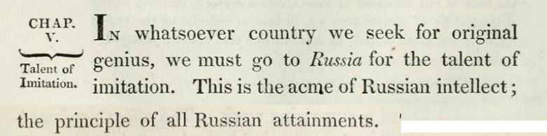 “У якій би країні ми не шукали оригінального таланту, за талантом наслідування слід вирушати до Росії. Це — вершина російського інтелекту; основа всіх їхніх досягнень”. – Едвард Кларк
