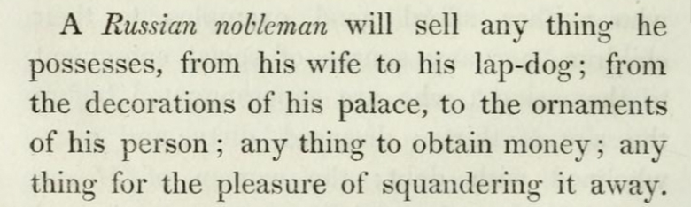 “Російський дворянин продасть усе, що має, від своєї дружини до свого собаки; від прикрас палацу до оздоб власної особи; усе, щоб здобути гроші; усе, аби мати задоволення марнувати їх. Відвідуючи торговця мінералами, ми були вражені, побачивши скляні шафи, наповнені придворними сукнями; і ще більше — дізнавшись, що це були сукні дворянок, виставлені на продаж, щоразу, як їм були потрібні гроші. Їхній звичай такий: робити замовлення на будь-яку суму, яку можна отримати в кредит; нічого не платити; і продавати все замовлене відразу після отримання. В Англії таку поведінку ми б назвали шахрайством. У Москві вона має іншу назву: тут її звуть російською величчю”.