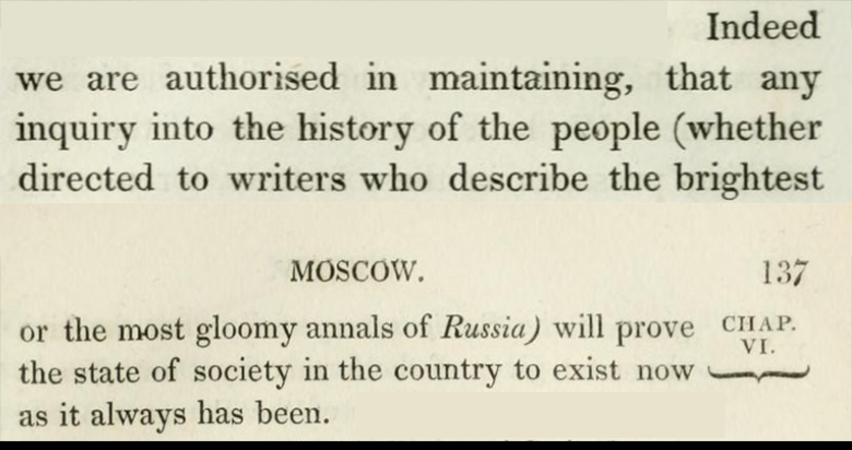 “Ми маємо підстави твердити, що будь-яке дослідження історії цього народу (байдуже — за авторами, які описують найсвітліші чи найпохмуріші сторінки російських літописів) доводить: стан суспільства в цій країні тепер такий самий, яким він завжди був. Основні свідчення (навіть від авторів явно прихильних) жодним чином не є сприятливими для характеру її мешканців.