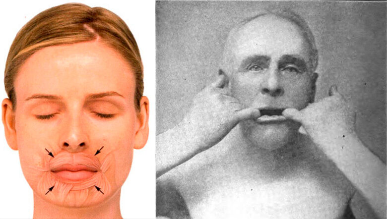 Так називає цей прийом Беннет. Насправді задіяні переважно м’язи щік. Сенфорд пропонує притиснути долоні щільно до щік і провести з відчутним натисканням вгору, до щік або куточків очей. Повторити 10-15 разів. Поступово можна збільшувати кількість повторень.